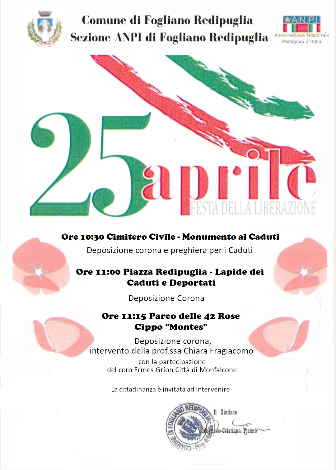 In occasione dell'Anniversario della Liberazione d'Italia, sabato 25 Aprile, si terrà una cerimonia commorativa alla quale il Comune di Fogliano Redipuglia e la sezione ANPI di Fogliano Redipuglia invitano a partecipare.