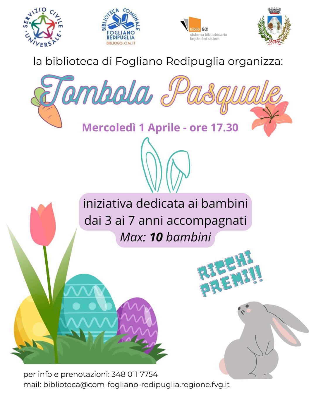 La biblioteca di Fogliano Redipuglia organizza, mercoledì 1 Aprile dalle ore 17.30, la tombola pasquale dedicata ai bambini dai 3 ai 7 anni.